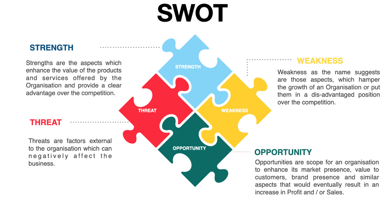 SWOT analysis is the analysis of an analysis of an Organisation's Strengths, Weaknesses, which are internal and Opportunities and Threats which are external in nature to an organisation. The objective of SWOT analysis is to examine within and around, important factors that influence business decisions.
